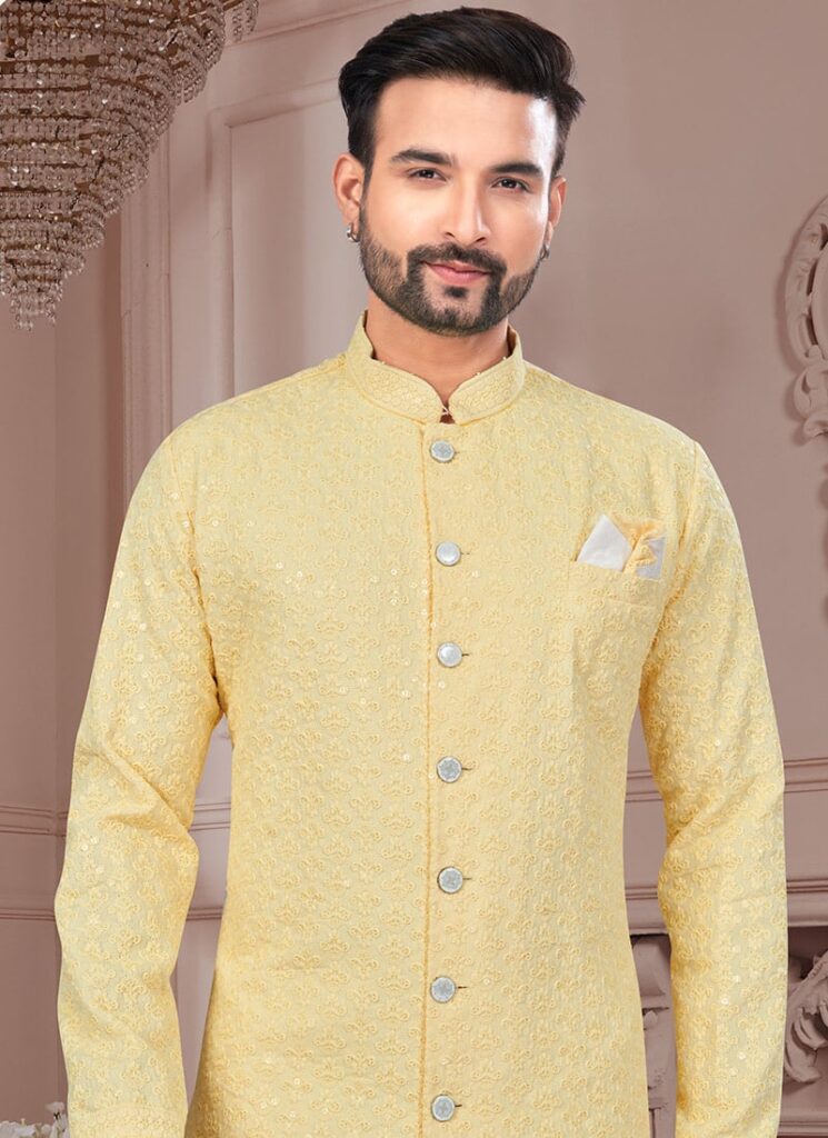 Light Yellow Rayon Embroidered Sequins Indowestern Sherwani