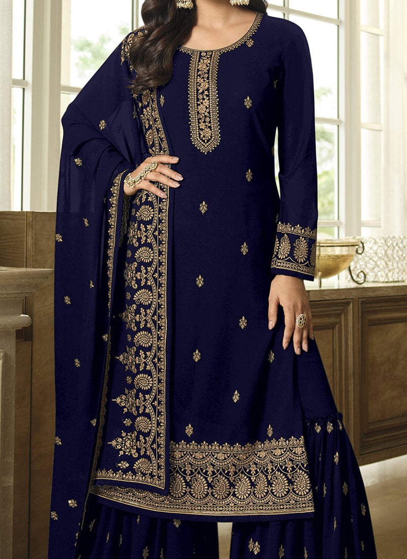 Adorned with intricate embroidery, the blue georgette kurta adds refined detailing that enhances the overall look. Paired with a flowy sharara, the outfit creates a striking silhouette that blends traditional charm with contemporary elegance. This Blue Georgette Sharara Suit with Embroidery is ideal for women seeking timeless style for weddings and evening events.
