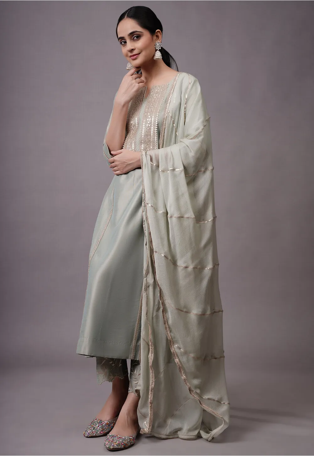 Elevate your festive style with this Dusty Green Sequinned Cotton Silk A-Line Suit, designed to offer understated elegance with a modern touch. Crafted from premium cotton silk fabric, this suit features subtle sequin embellishments that add a refined festive shimmer, making it an excellent choice for parties and special occasions.