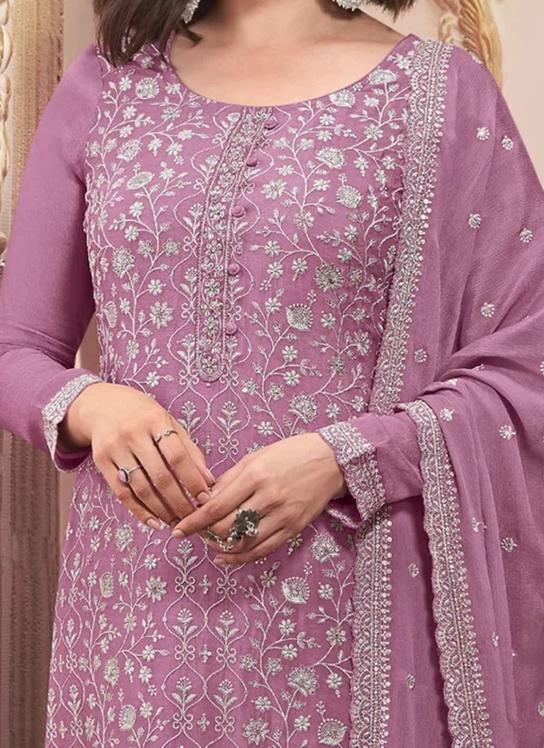 The Lavender Chinon Silk Stone Embroidered Sequins Straight Pant Suit is a sophisticated ethnic ensemble designed for elegant festive and party wear occasions. Crafted from luxurious chinon silk, this suit offers a soft sheen and graceful drape that enhances its refined pastel appeal.