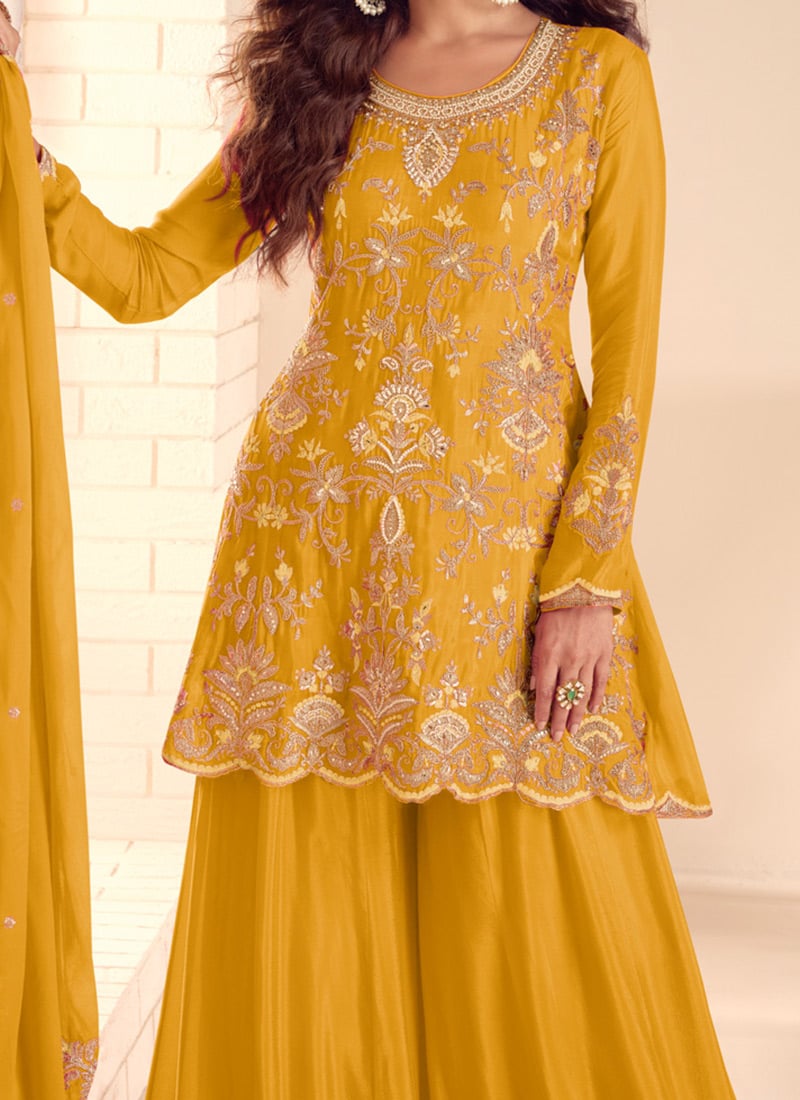Brighten your festive wardrobe with this Yellow Chinon Sharara Suit with Zari, Bead & Thread Embroidery, designed to deliver vibrant elegance with traditional charm. Crafted from premium chinon fabric, this sharara suit features intricate zari, bead, and thread embroidery that adds rich texture and festive brilliance, making it a perfect choice for celebrations and party wear.
