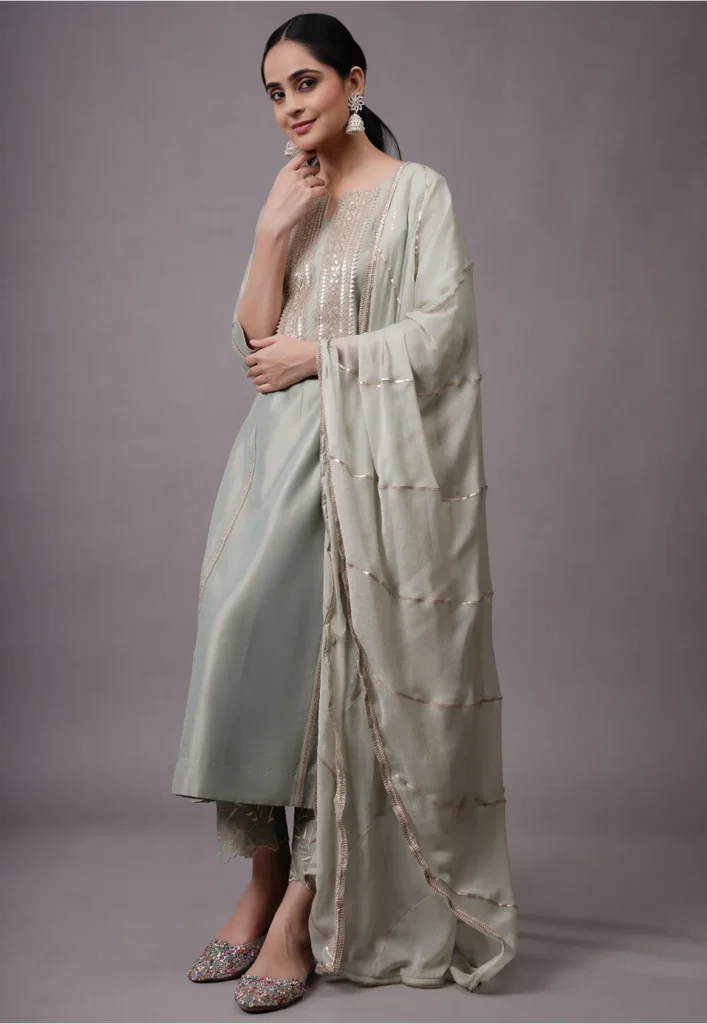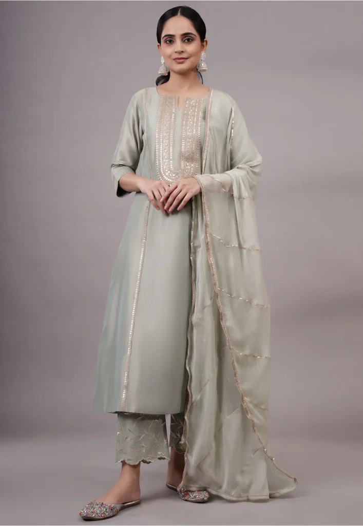 Dusty Green Sequinned Cotton Silk Aline Suit